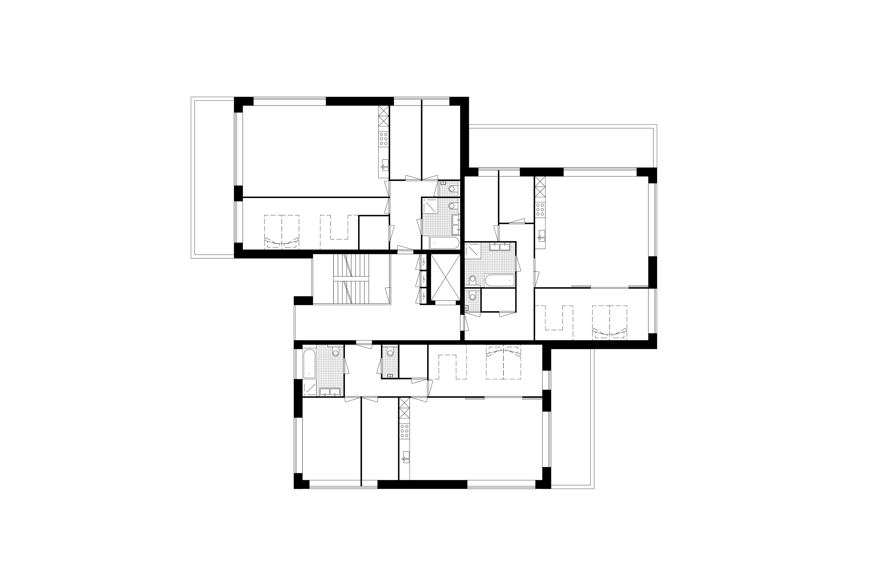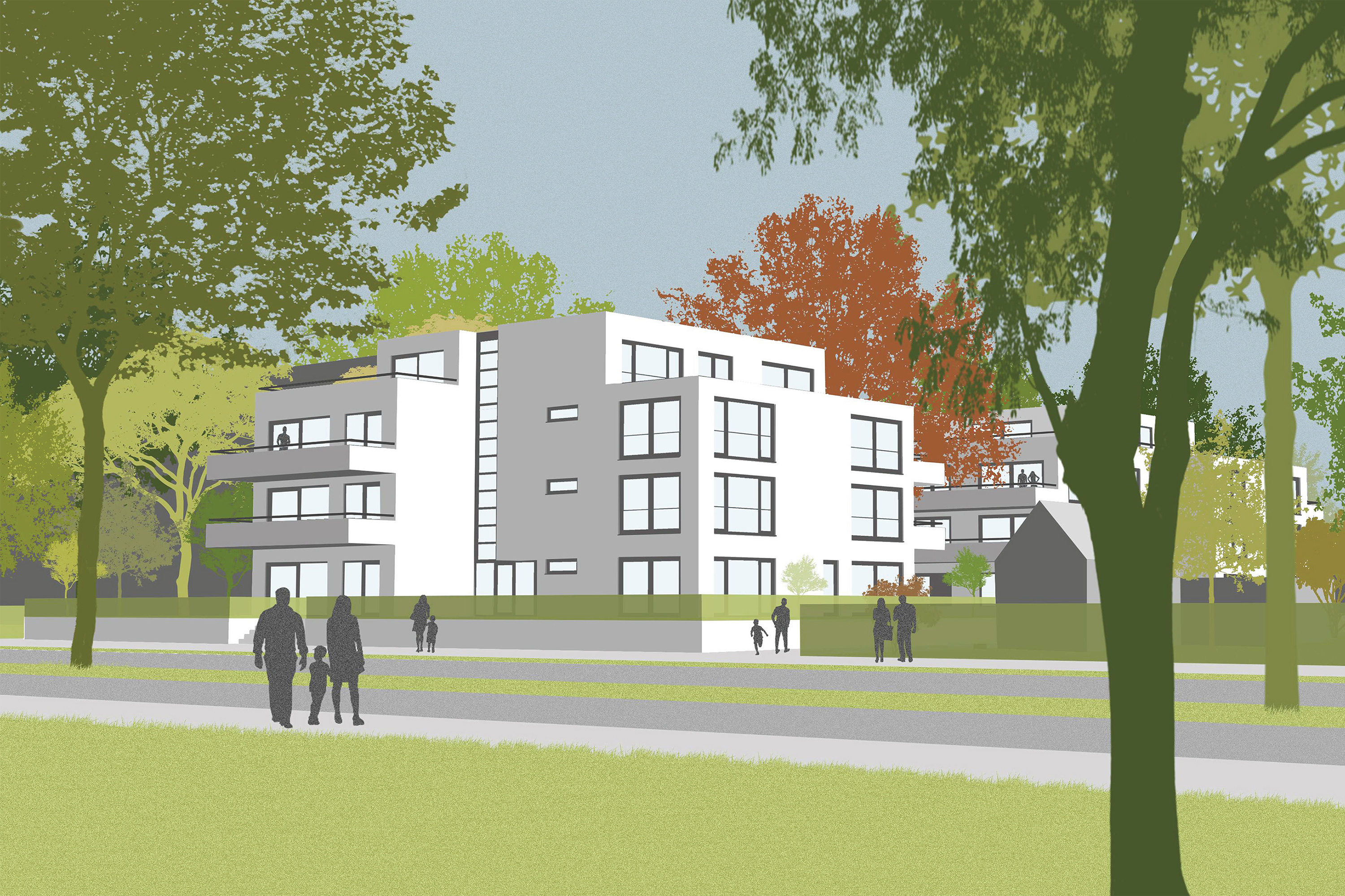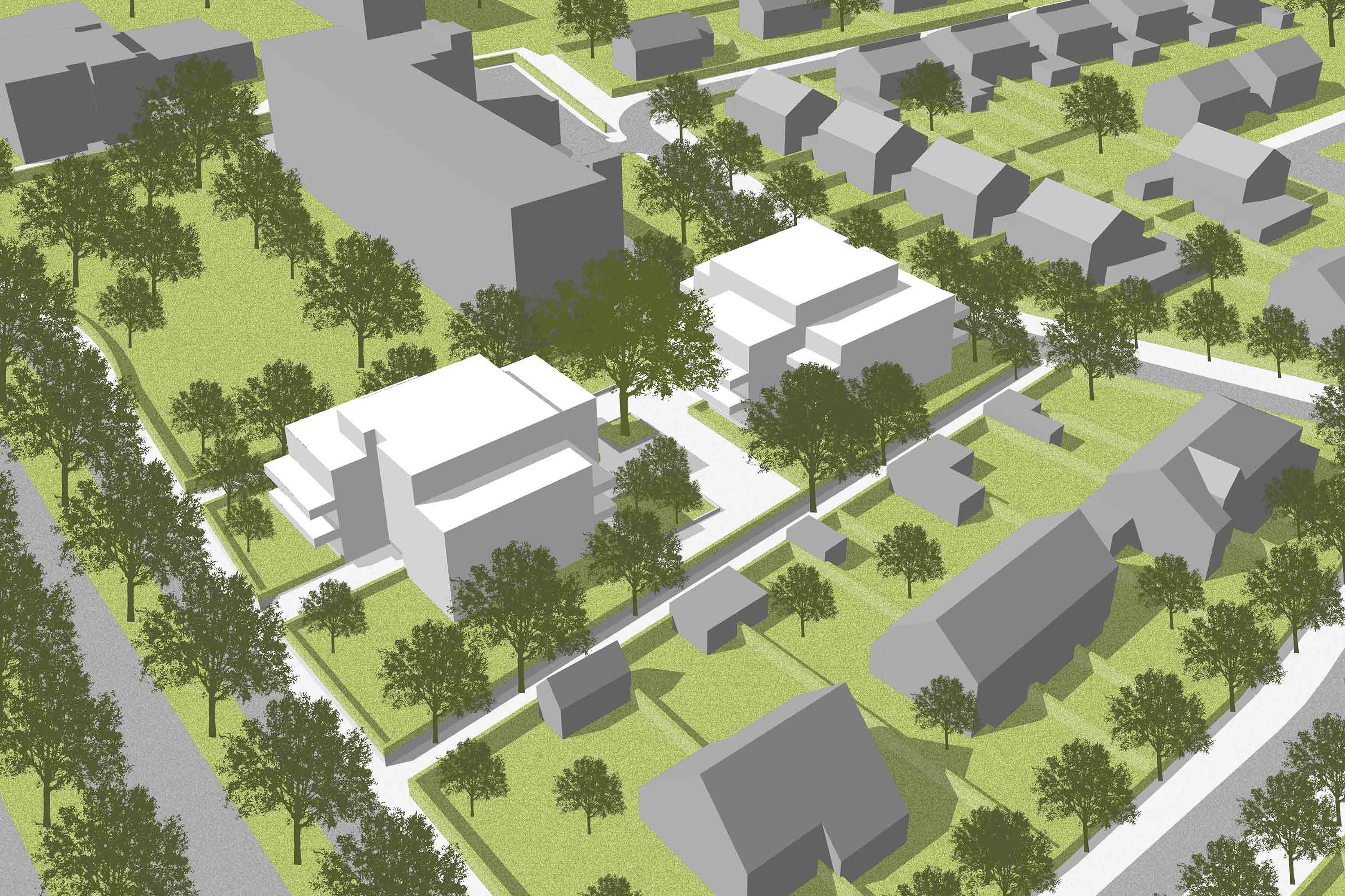 In het ontwerp worden twee vrijstaande stadsvilla’s op het perceel gesitueerd. In zijn schaal en volumeopbouw vormt dit drie- tot vierlaagse ensemble een vanzelfsprekende overgang van de tweelaagse villa’s met schuine kappen naar het zeslaagse flatgebouw. Elk van de twee stadsvilla’s bestaat uit drie volumes wat maakt dat deze een kleinschalig en bij de locatie passend karakter hebben.