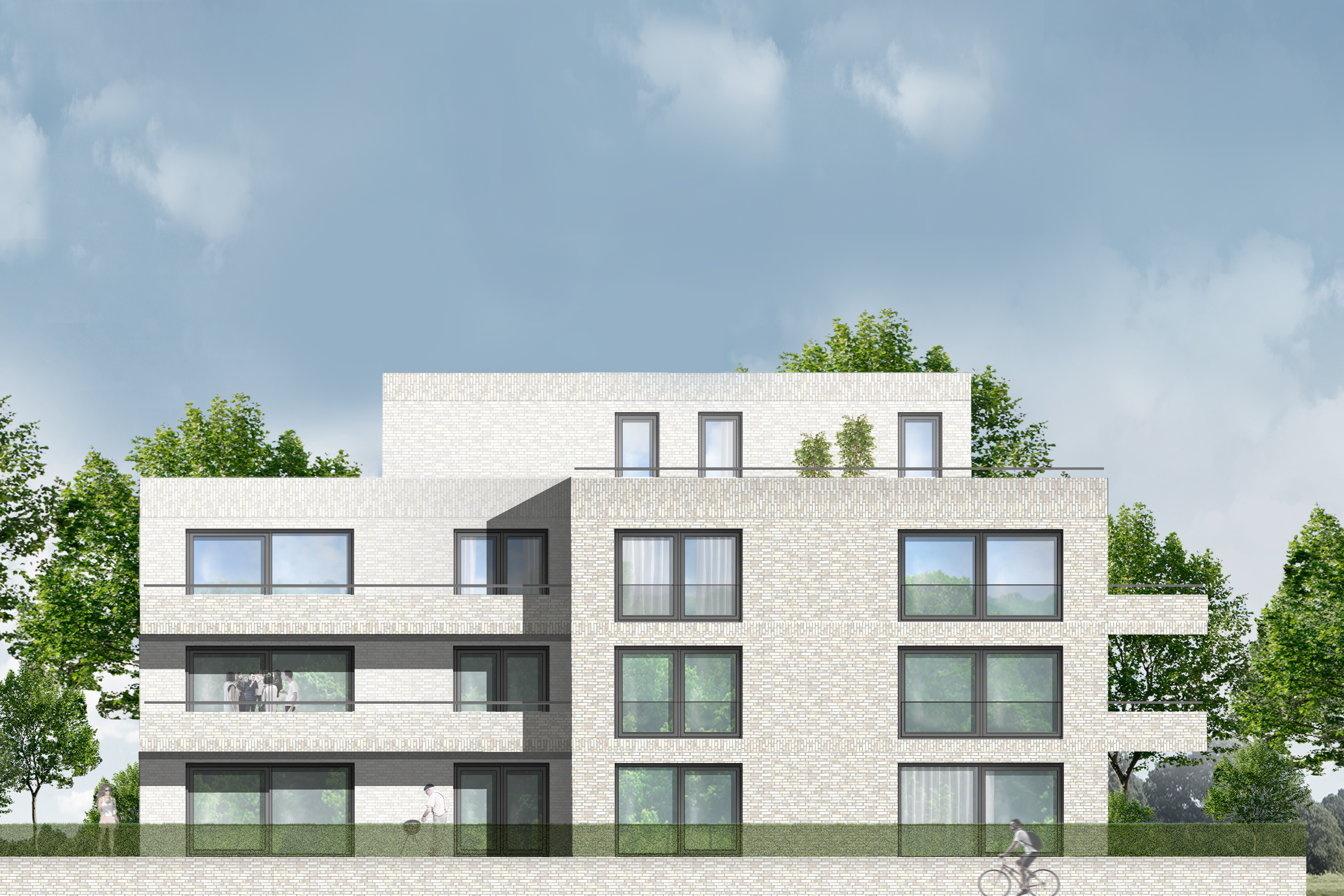 Voor de uitstraling werd gekozen voor het toepassen van lichte grijsbruine gevelstenen en antracietkleurige aluminium schuifpuien met glazen balustraden. In de gevelwanden, balkons en dakranden worden subtiele verfijningen aangebracht met verschillende metselwerkverbanden.