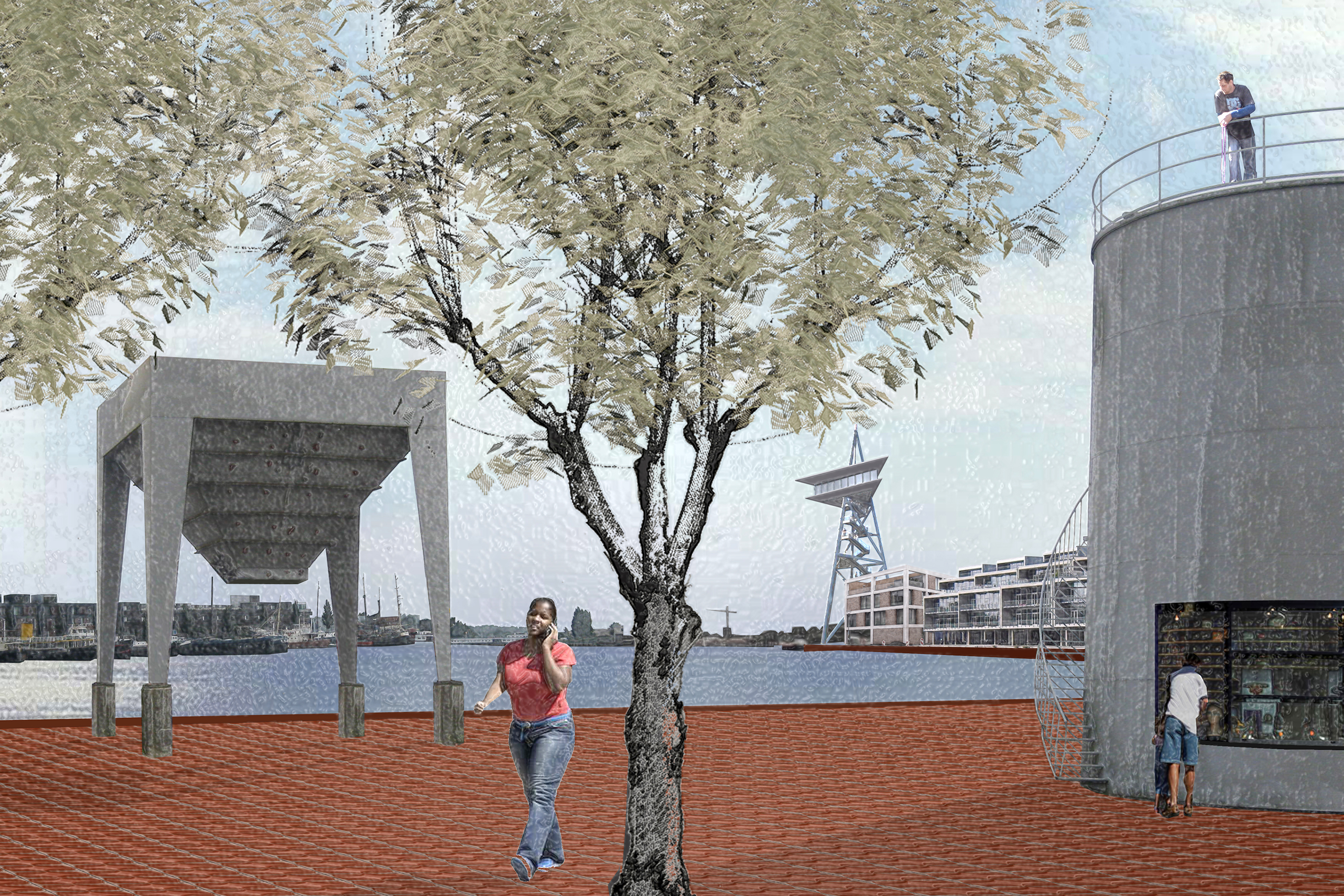 Het verleden als haven van Amsterdam is op het Cruquiuseiland nog goed voelbaar. Kranen, silo’s, zandtrechters en spoorlijnen zijn bewaard gebleven. Deze industriële fragmenten zijn het startkapitaal voor de toekomstige identiteit en worden hergebruikt voor nieuwe functies. Zij vormen de aanleiding voor incidenten in het rationele stedelijke patroon van toekomstige bouwvelden. Om dit effect verder te versterken wordt een oude havenkraan als iconisch gebouw op de kop van Cruquiuseiland geplaatst en voorzien van een openbaar uitzichtplatform en een horecagelegenheid.