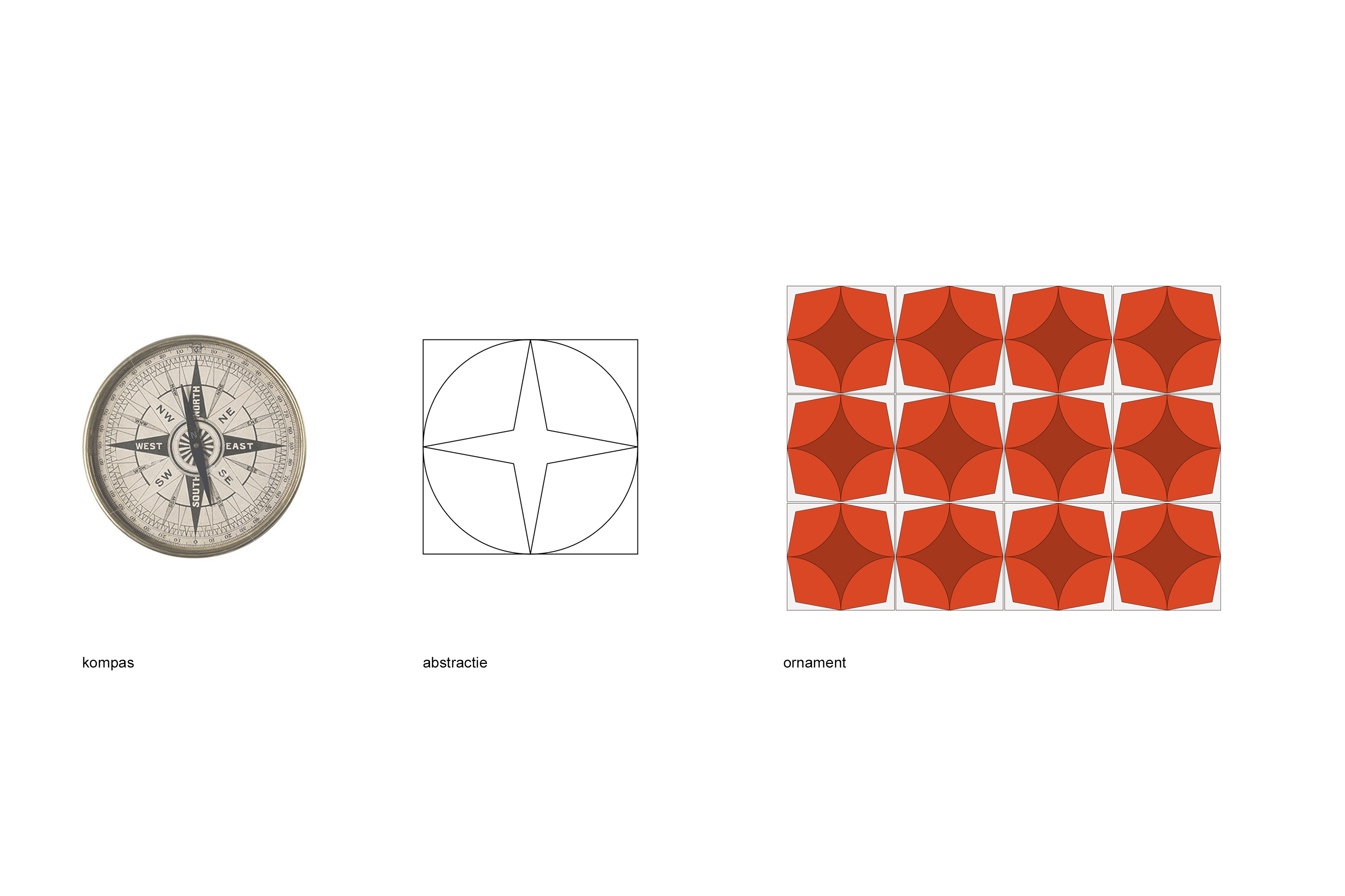 Een bijzondere bestrating van rode betontegels met symbolen uit het maritieme verleden versterkt de samenhang tussen de verschillende openbare ruimtes langs het water. Deze rode loper vormt het decor waarop de fragmenten uit het industriële verleden als waardevolle schatten worden gepresenteerd.