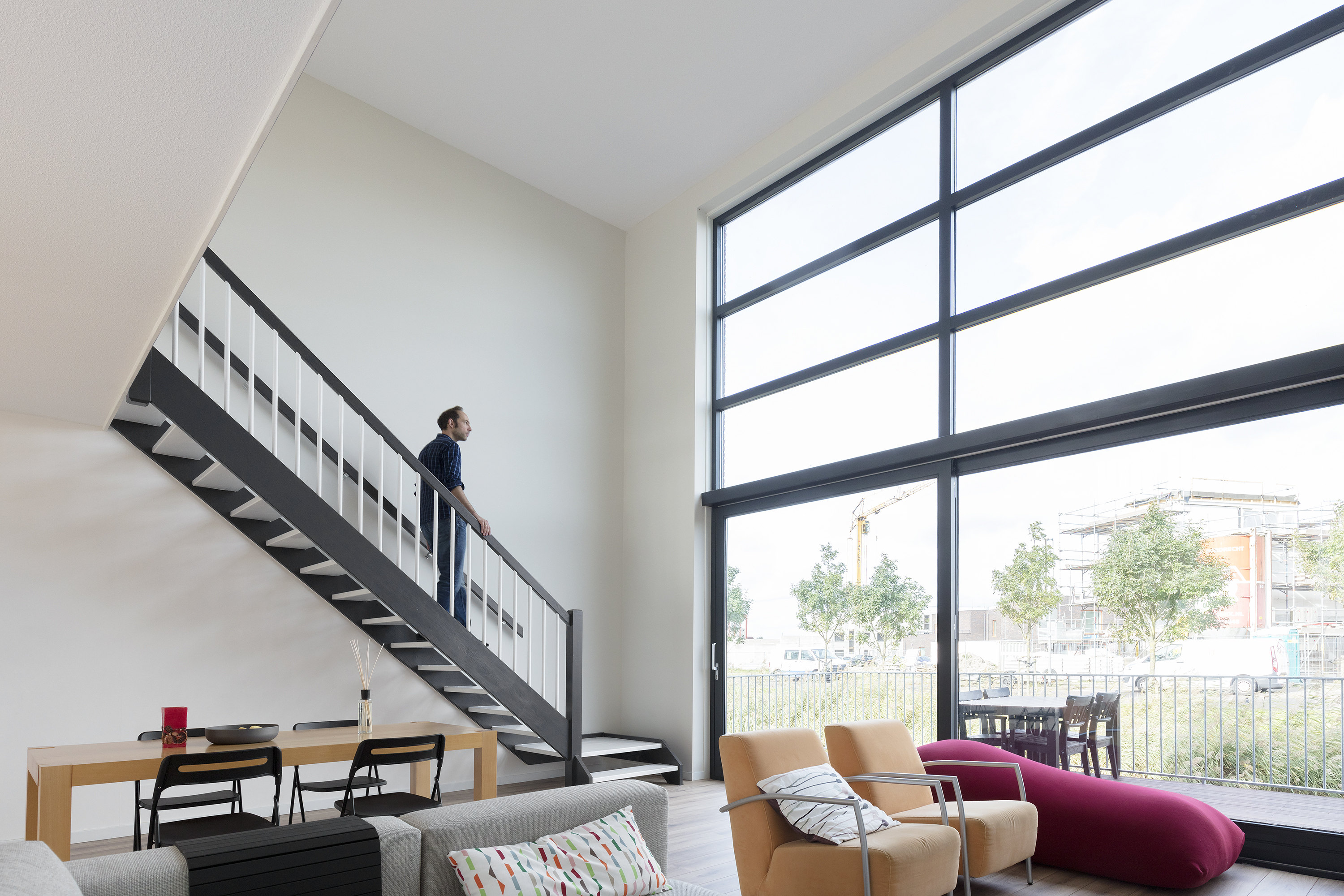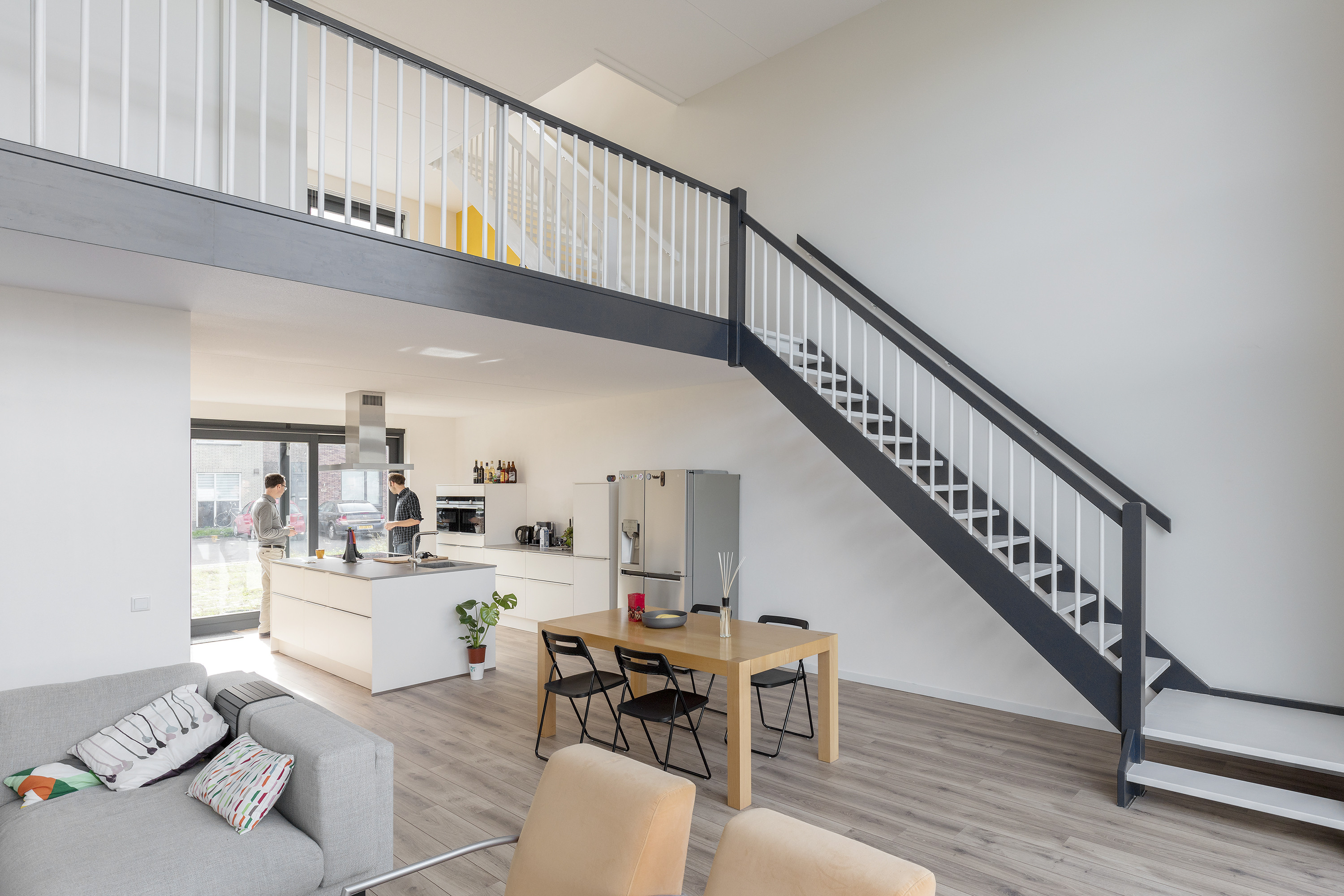 Op de verdiepingen zijn een gastenverblijf, een open werkruimte, drie slaapkamers en de badkamer gelegen. Deze ruimtes zijn bereikbaar via twee rechte, houten trappen. Omdat de twee rechte trappen in het verlengde van elkaar liggen ontstaat een mooie lange zichtlijn door de woning heen.
