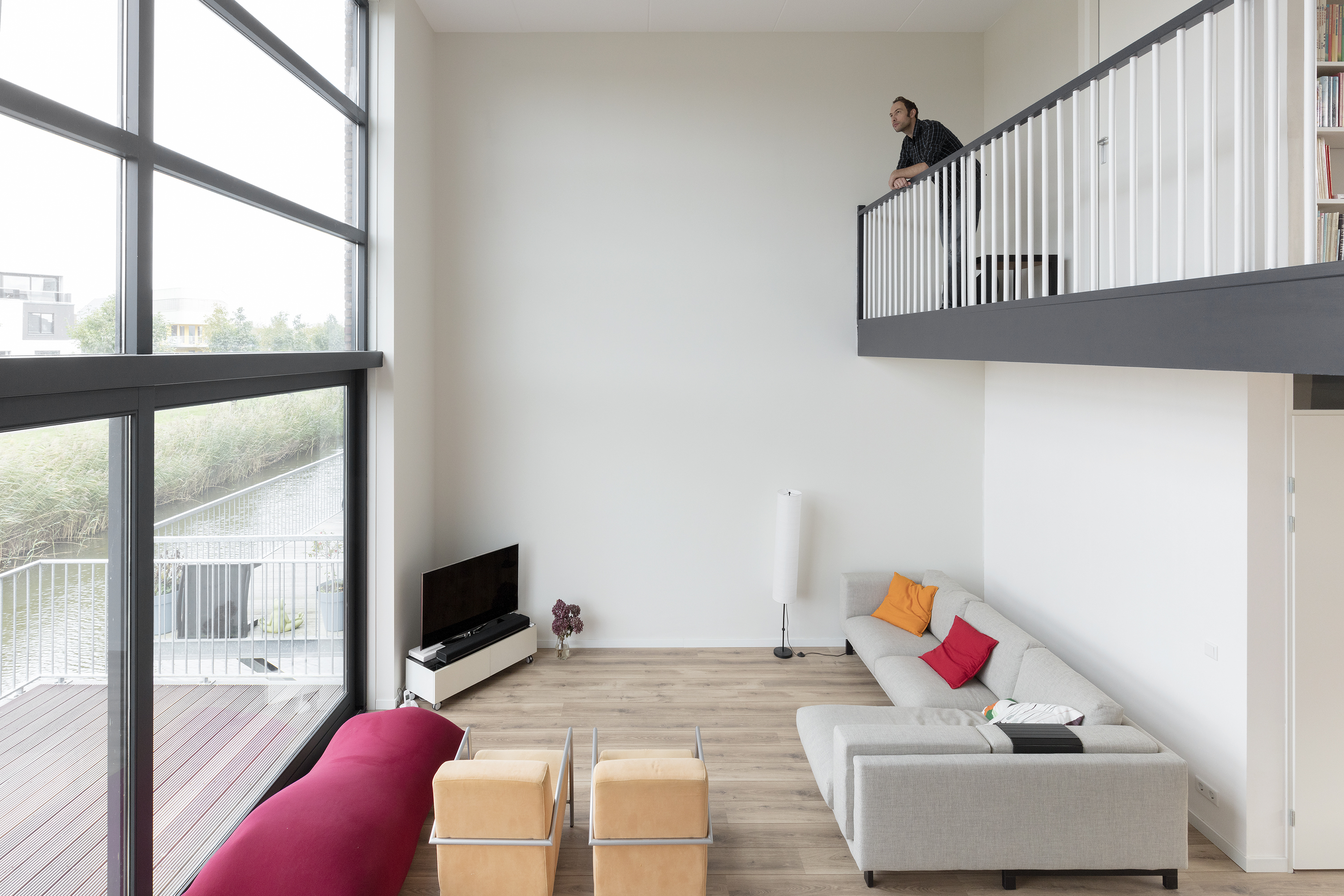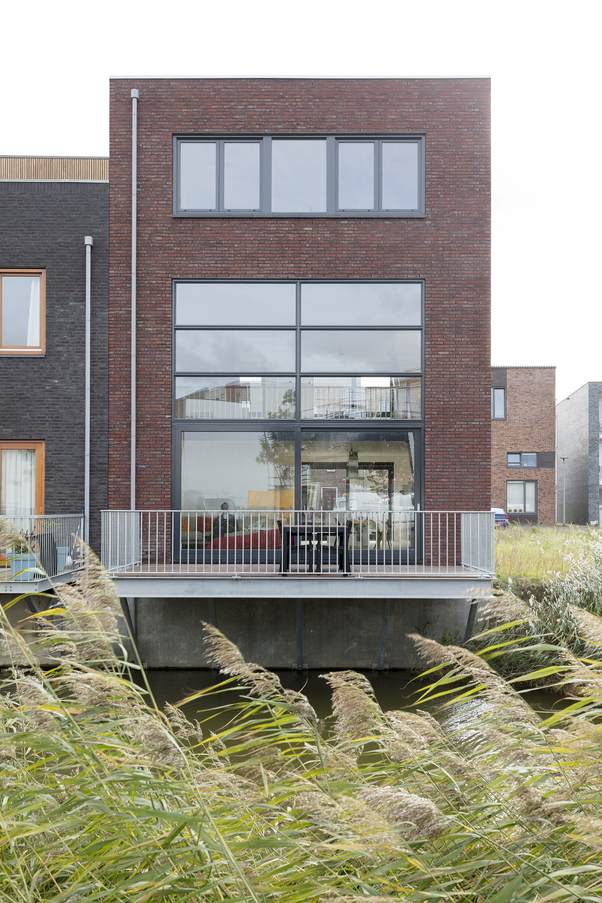 Op een zelfbouwkavel in Almere-Poort is een uitzonderlijk ruime en lichte tussenwoning gerealiseerd. Deze woning maakt optimaal gebruik van de bijzondere ligging. Aan de straatzijde is een riante voortuin aanwezig en aan de achterzijde grenst deze 7 m brede woning direct aan de Hectorsingel. Om deze twee kwaliteiten te combineren zijn de keuken aan de tuinzijde en de woonkamer aan de gracht als een grote samenhangende leefruimte vormgegeven.