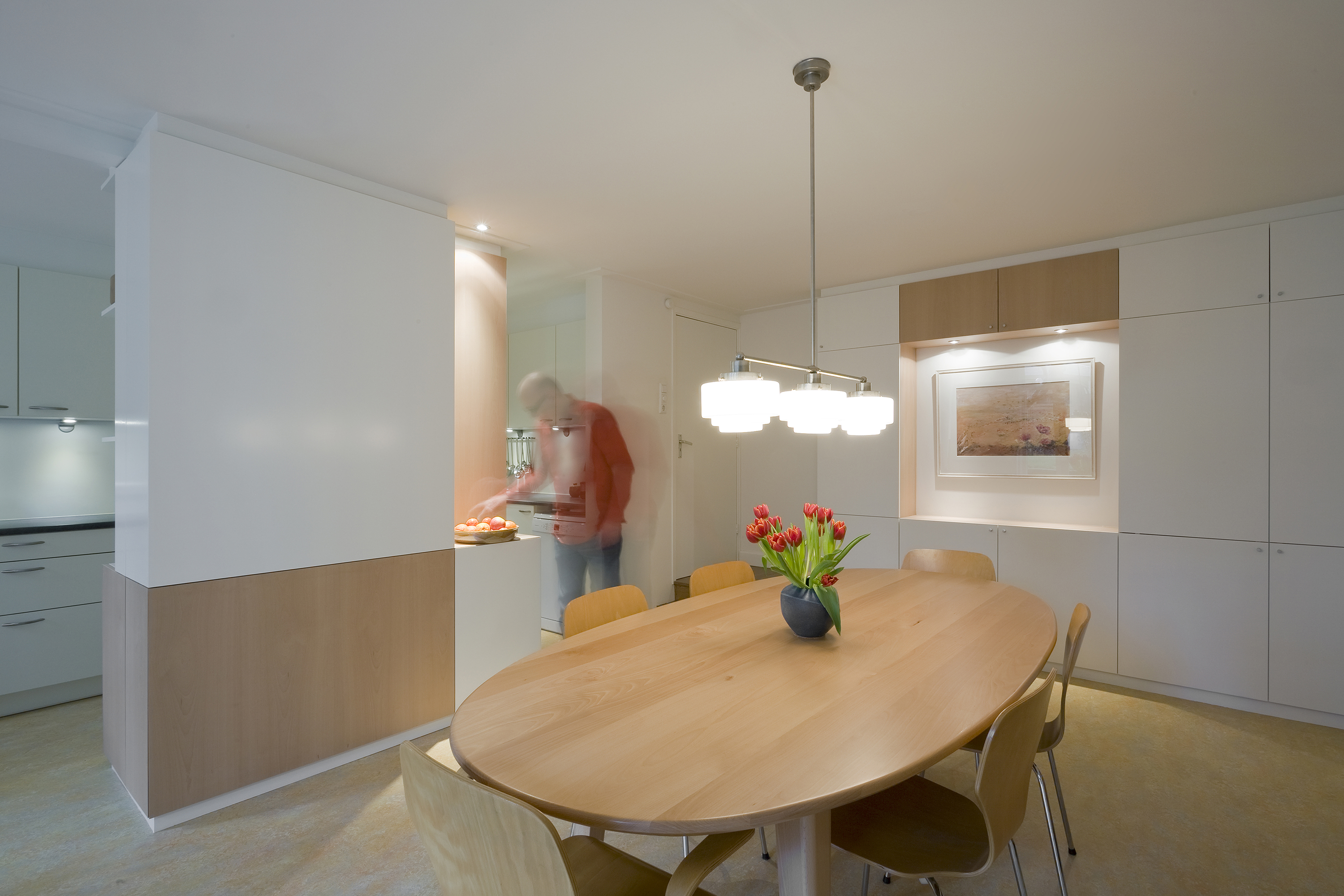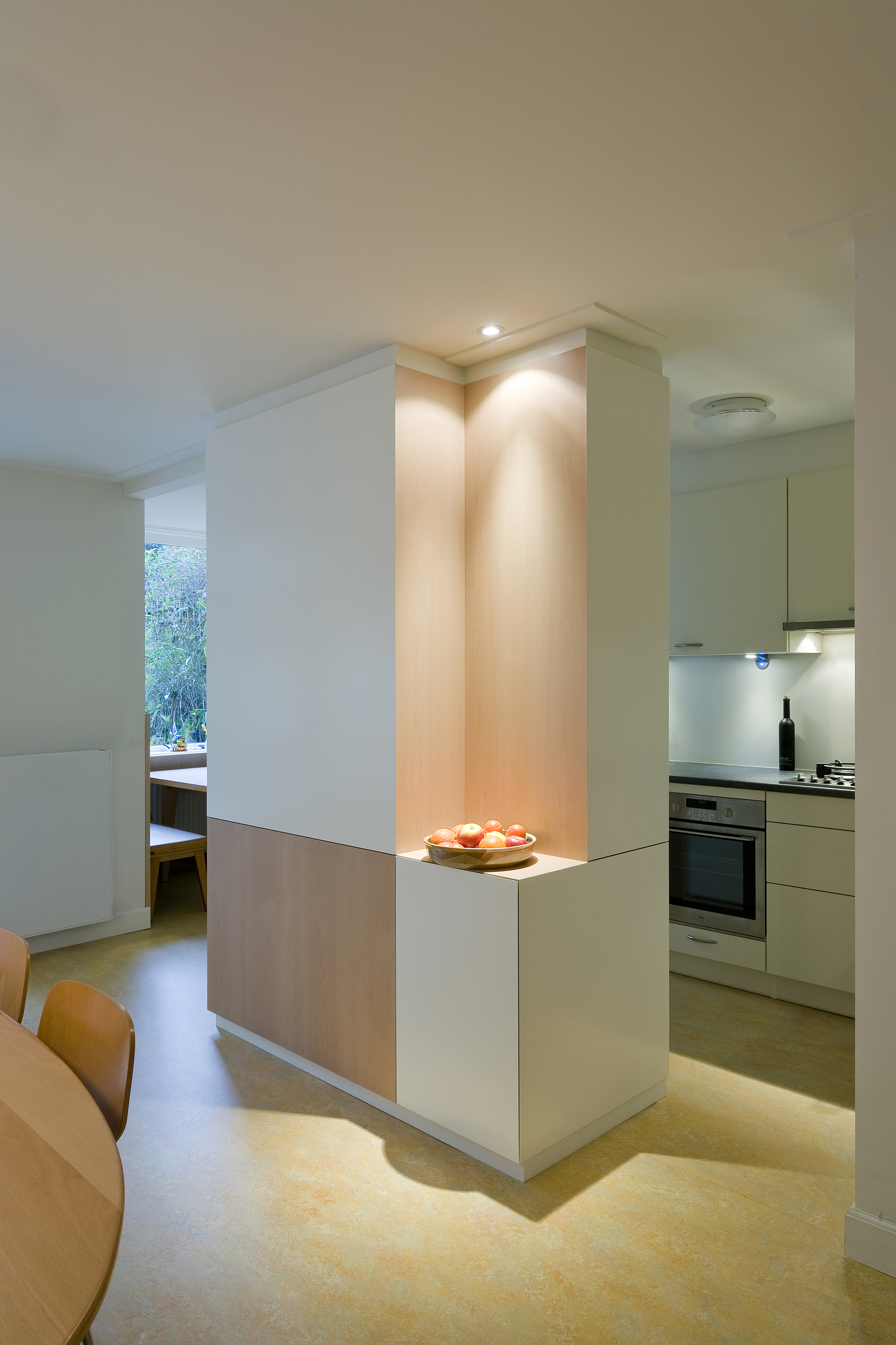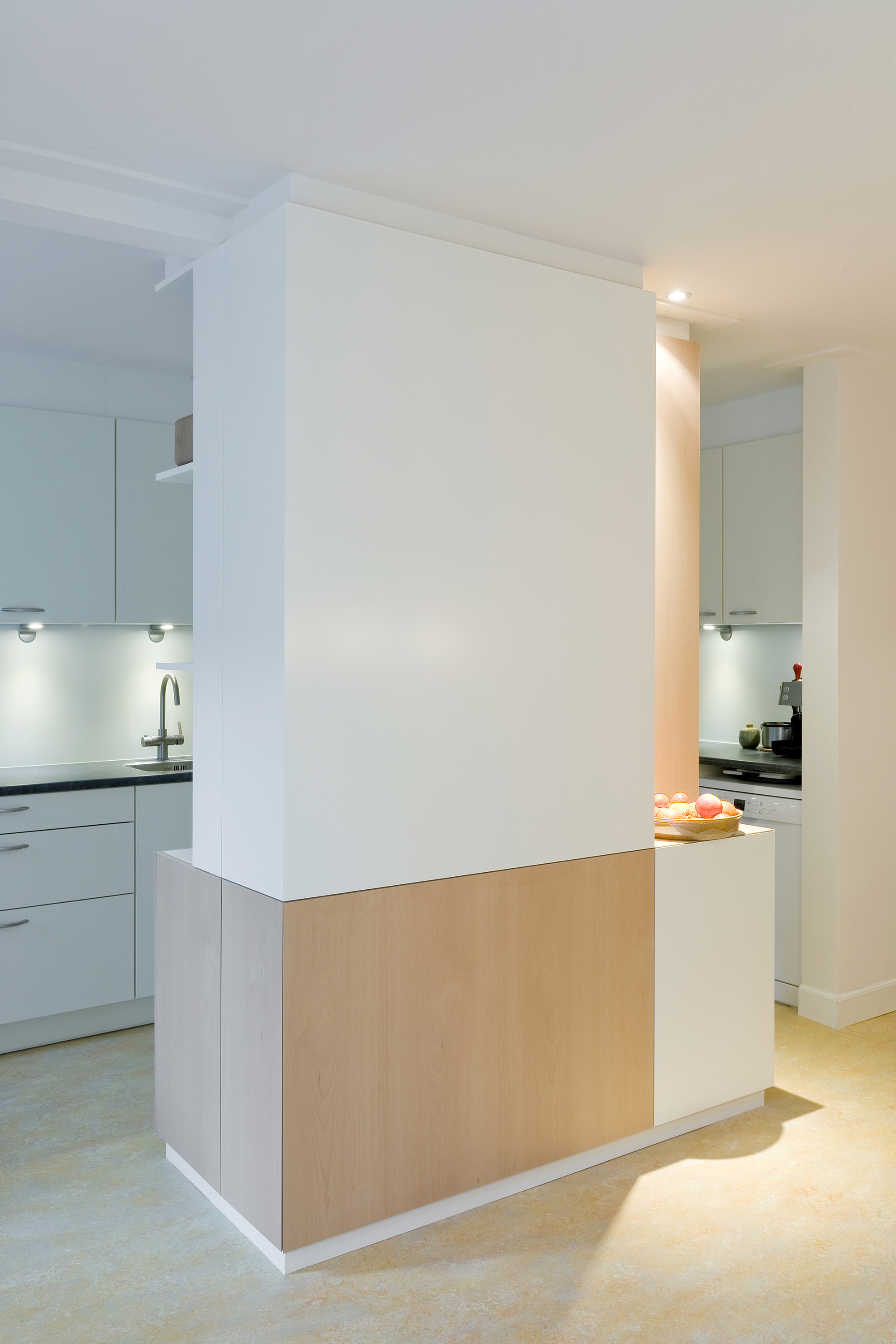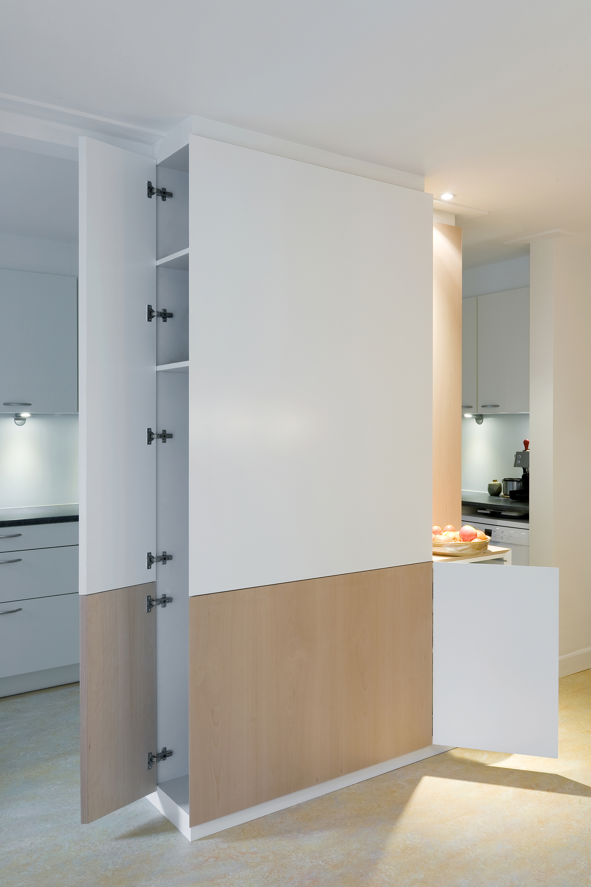 Om aan de wens naar veel kastruimte te kunnen voldoen werden een tweetal nieuwe inbouwkasten gerealiseerd. Één van deze maatwerk meubels vormt een vrijstaand object tussen de keuken en de eetkamer in. In deze kast is een constructieve wand opgenomen en aan de keukenzijde werd een hoge koelkast geïntegreerd.