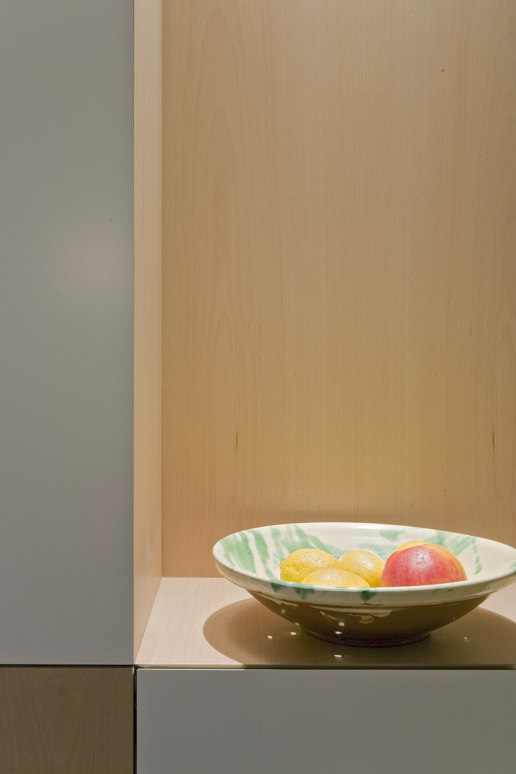 Naast de diverse kastruimtes zijn er twee speciale plekken voor het tentoonstellen van bijzondere objecten en schilderijen gecreëerd. Deze bijzondere situaties worden duidelijk geaccentueerd door een geïntegreerde verlichting aan te leggen en de kastdelen in beuken fineer af te werken. Op cruciale punten zijn de hoeken van de meubels op verstek gedetailleerd en worden greeploze kastdeuren toegepast zodat er een verfijnde en minimalistische uitstraling ontstaat.