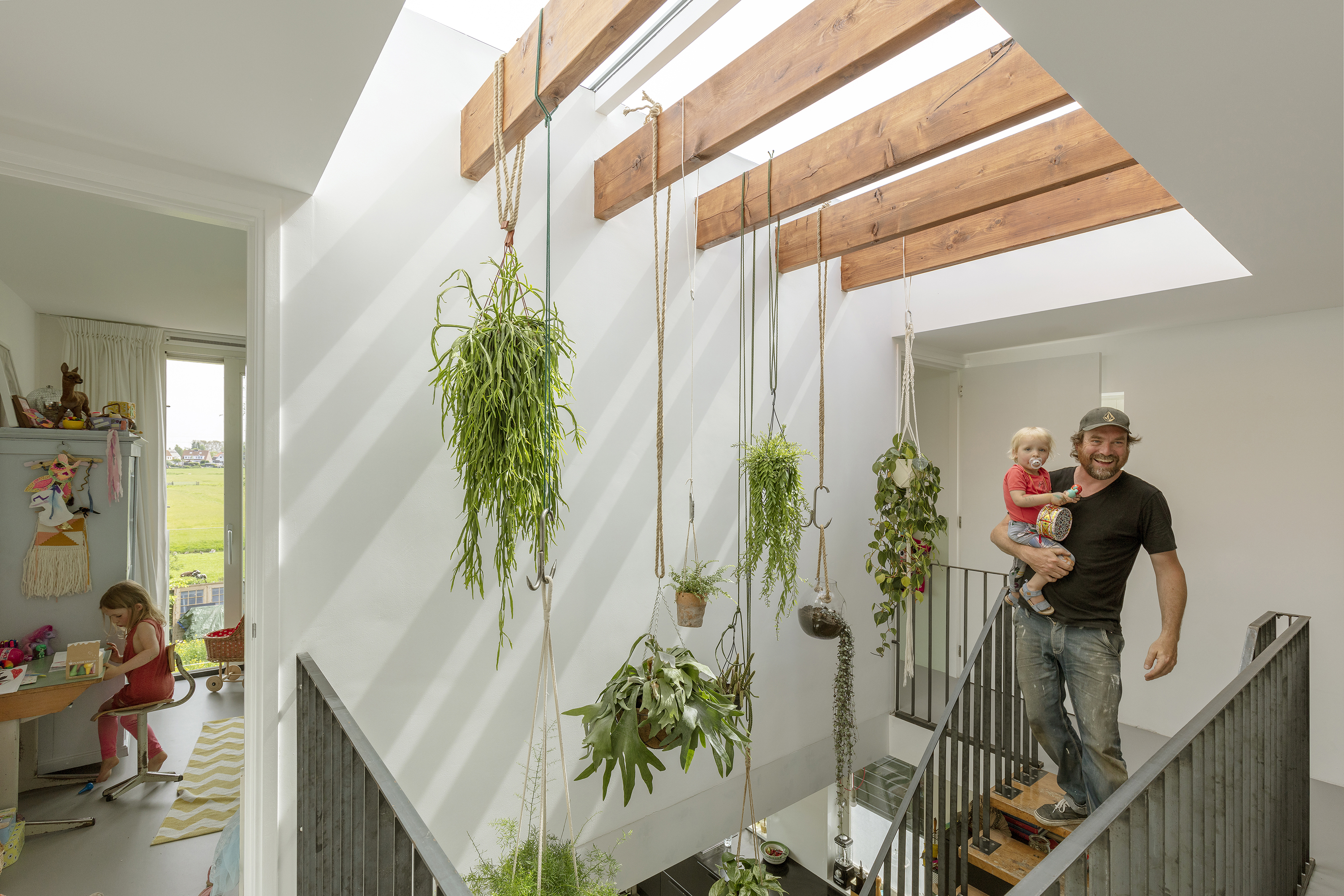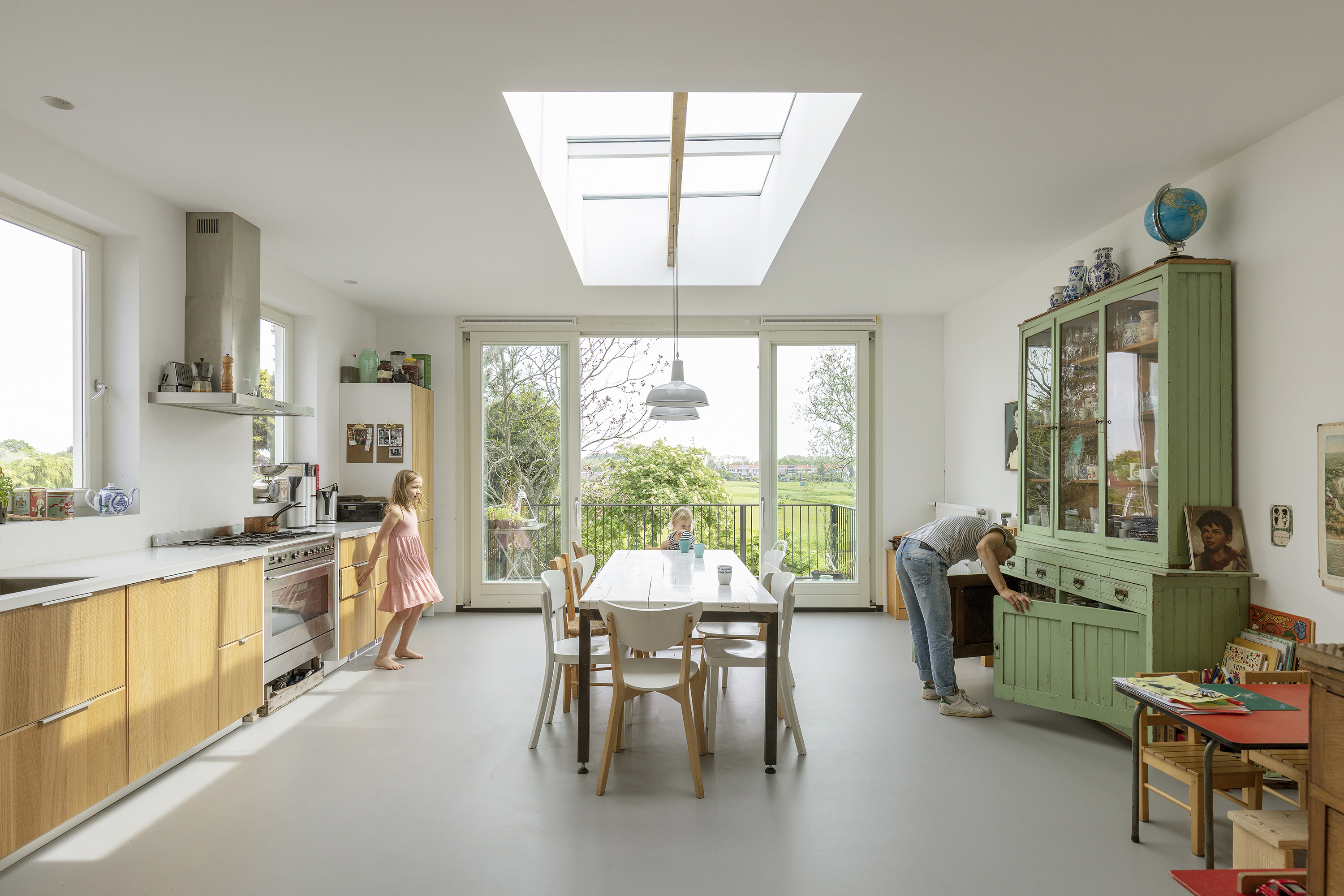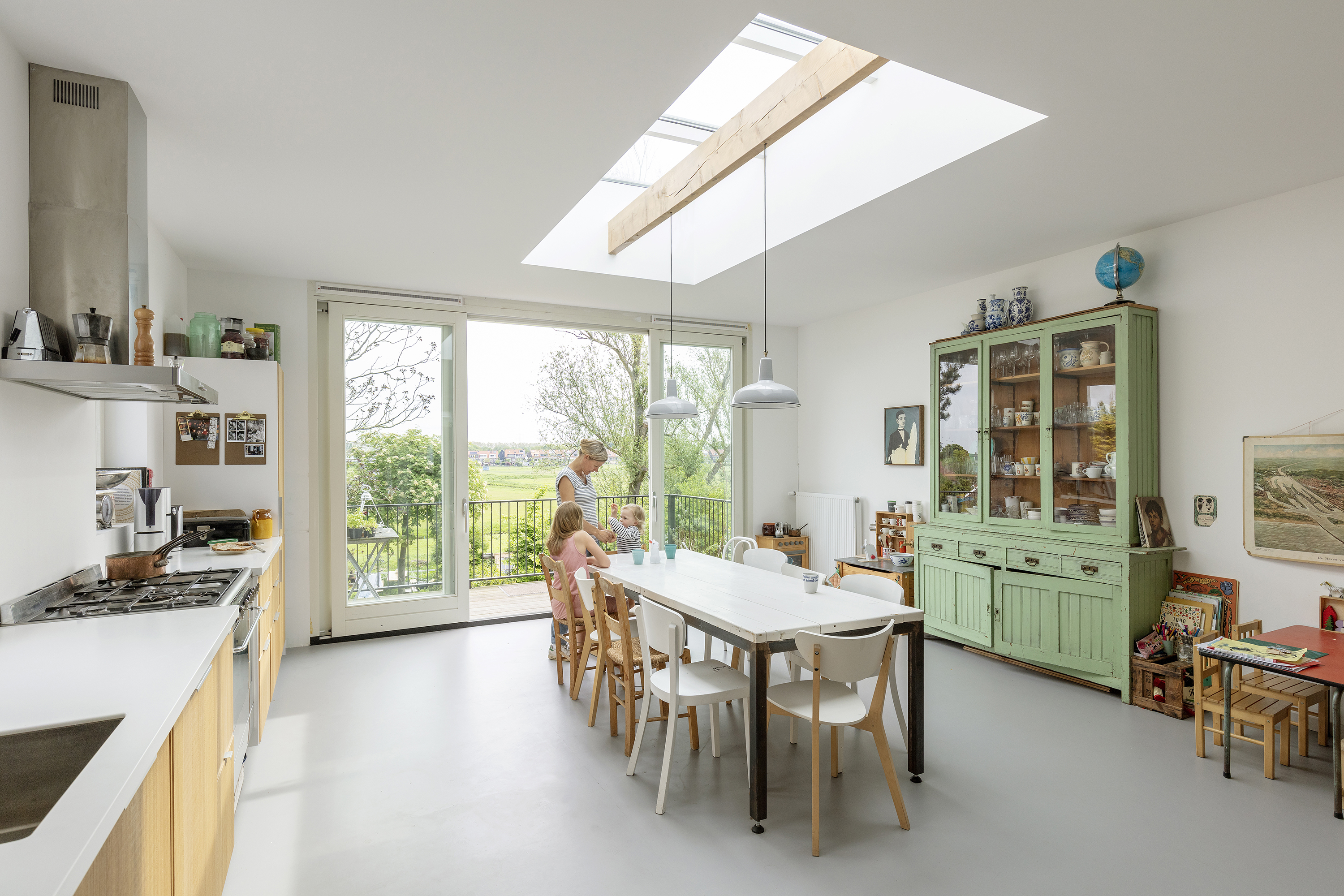 De verbouwing van de twee woningen verschilt in de opzet. Bij de linker woning werd gekozen om de woonkeuken en zitkamer op dijkniveau te realiseren. Boven de eettafel werd een groot daklicht gerealiseerd. Vanuit de woonkeuken en vanaf het balkon heeft men een mooi uitzicht op de Wilmkebreekpolder en de landelijke bebouwing in de omgeving. Bij de rechter woning werd het keuken- en woongedeelte op tuinniveau gerealiseerd. Om deze ruimtes te voorzien van veel daglicht werd boven de vide in het hart van de woning een lichtstraat toegepast. Voor de centrale trap werden de bestaande houten traptreden van een gesloopt kantoorpand hergebruikt.