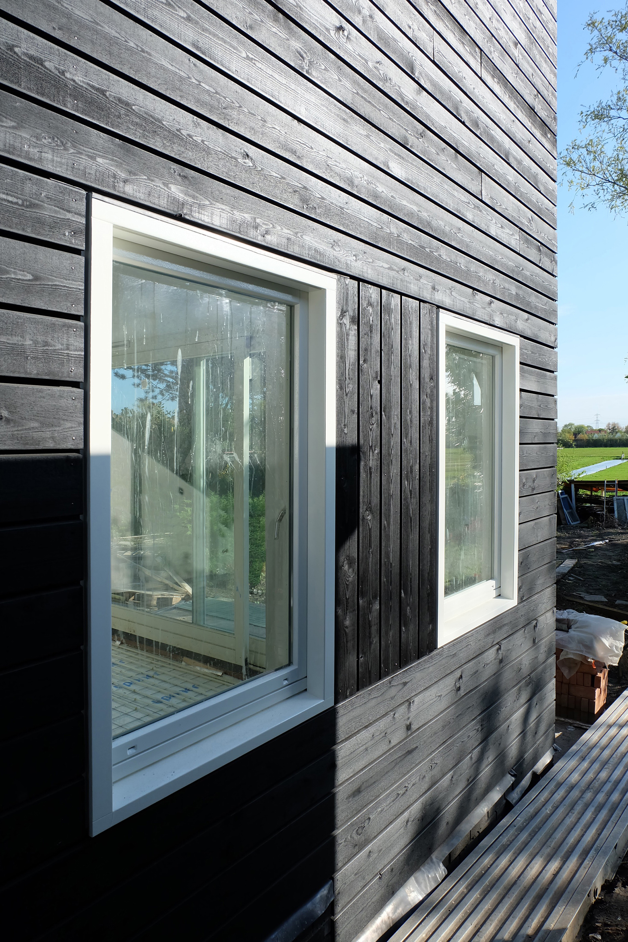 In de gevels werd belang gehecht aan het duidelijk leesbaar houden van het oorspronkelijke oude gebouw en de nieuwe ingrepen. De uitbreidingen van de twee woningen zijn uitgewerkt met zwarte houten geveldelen en witte kozijnen. De twee aan de straatzijde gerealiseerde dakkapellen hebben een moderne uitstraling met stevige witte kozijnkaders.