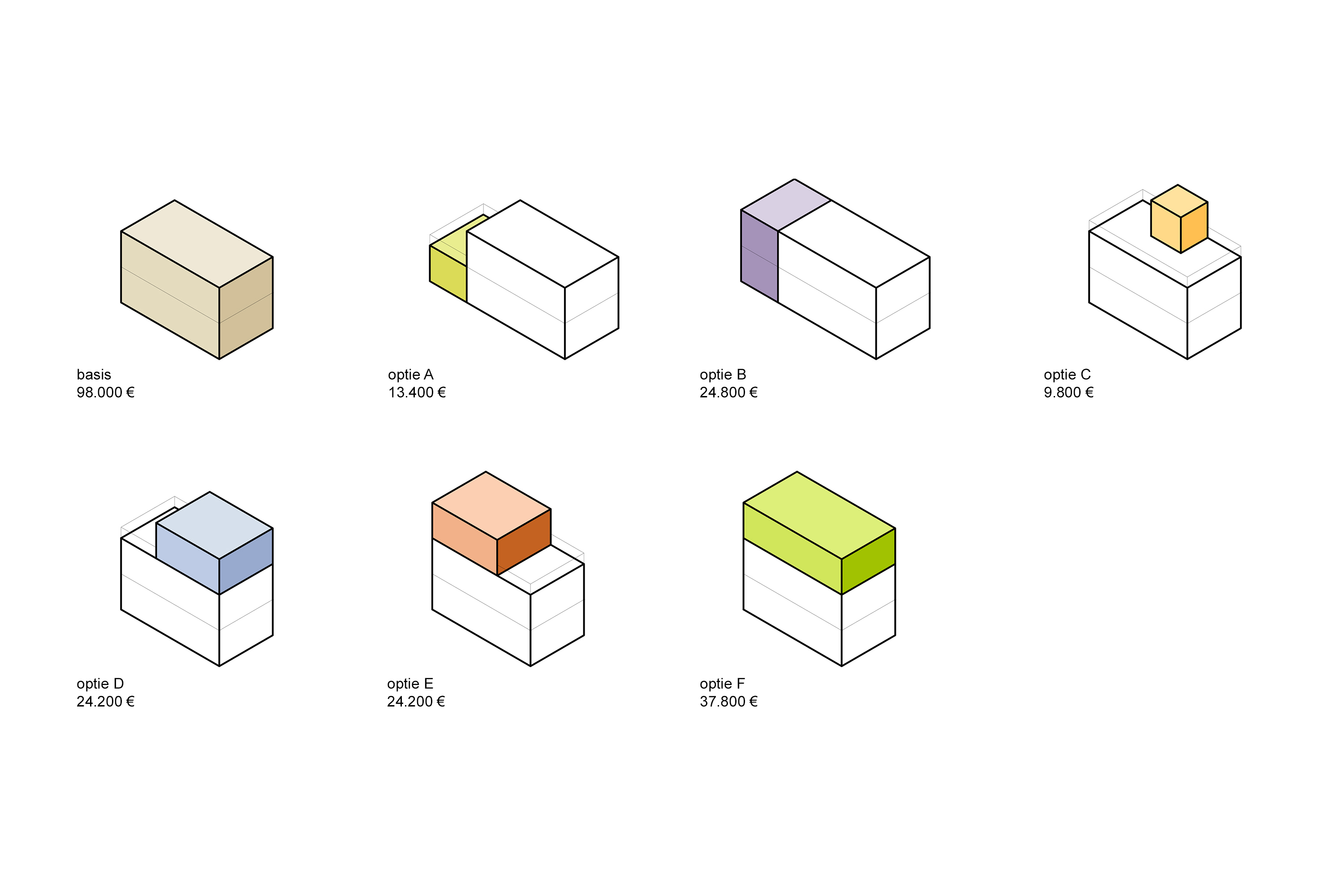 De zes uitbreidingsmogelijkheden worden voor een vaste prijs aangeboden en zouden in afstemming met de desbetreffende gemeente vergunningsvrij kunnen worden geplaatst. Deze varianten kunnen ook met elkaar worden gecombineerd. Daarnaast kan worden gekozen uit diverse gevelafwerkingen in metselwerk of hout, en uit een breed palet aan sanitair en tegelkleuren.