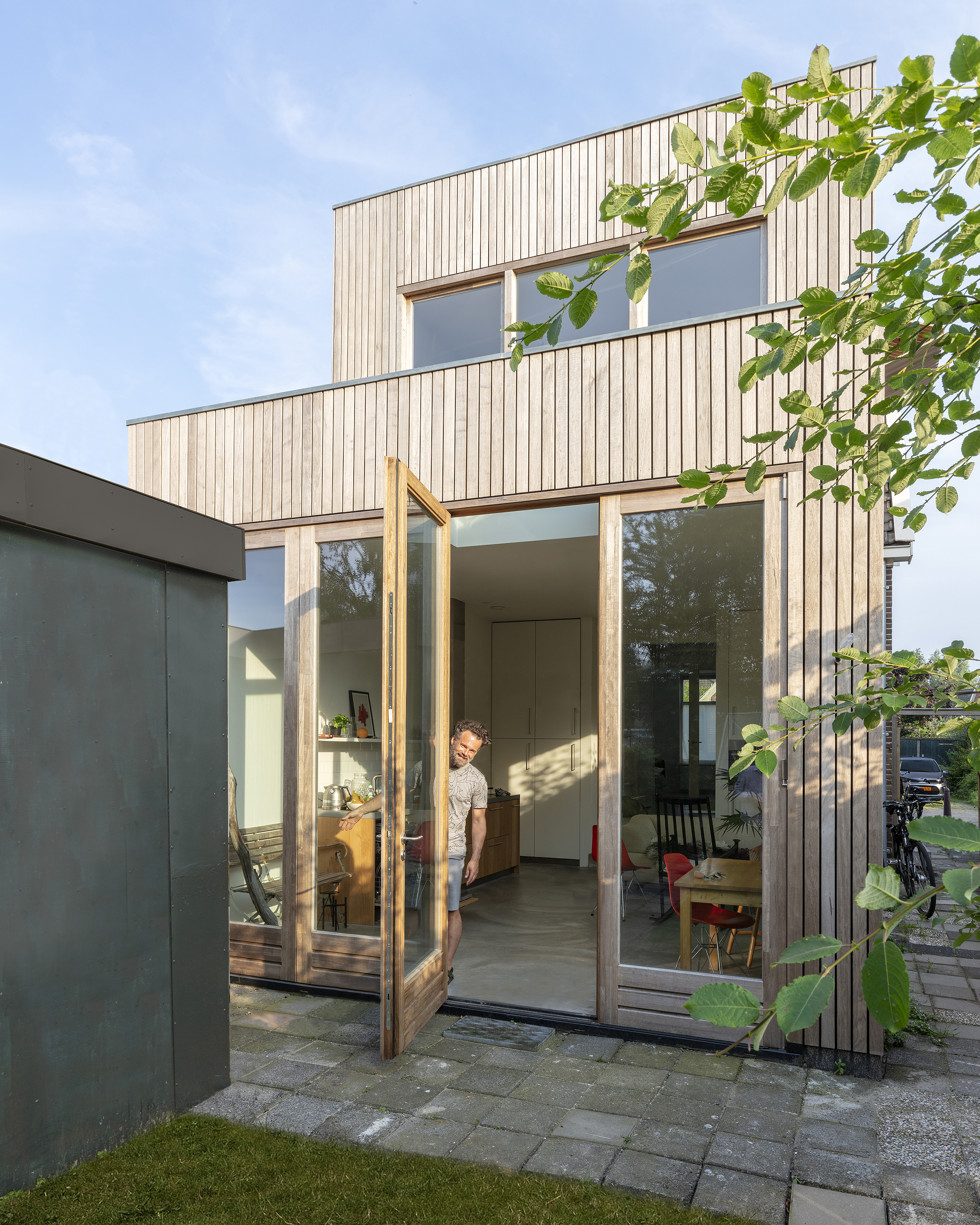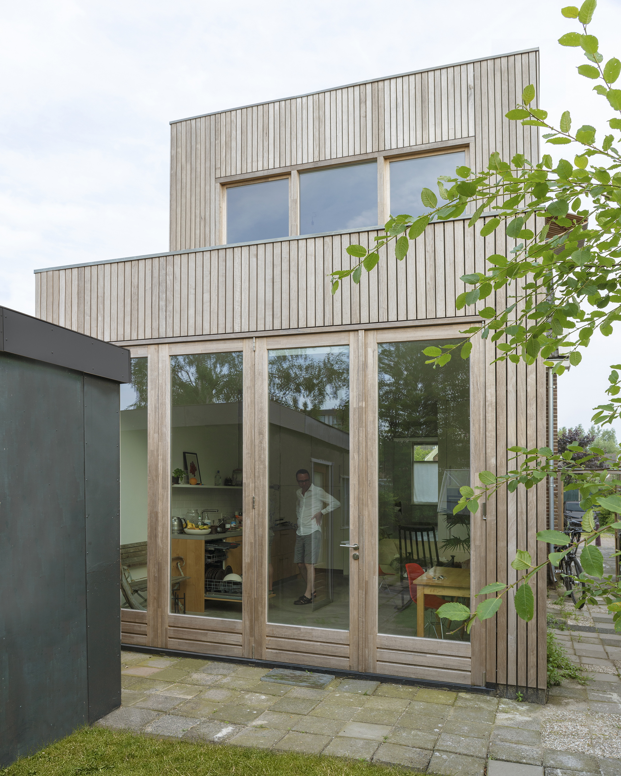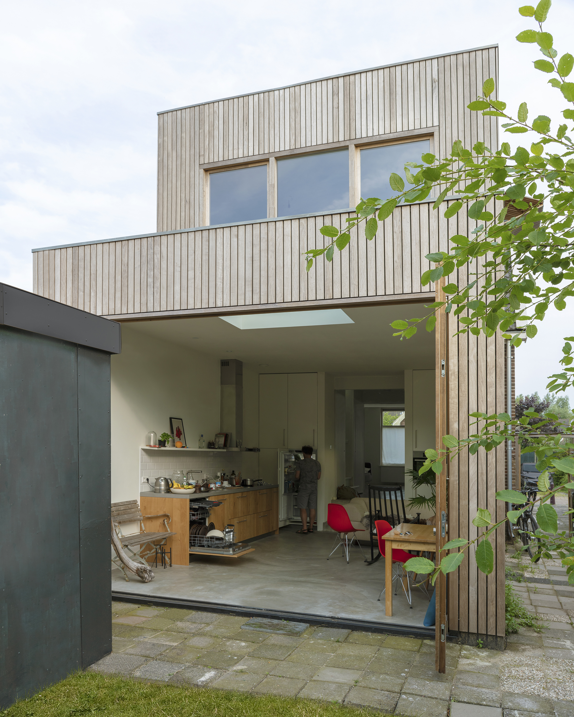 In het nieuwe bouwdeel werd op de begane grond een verrassend hoge en lichte eetkeuken gerealiseerd. Deze ruimte staat door middel van dubbele schuifdeuren in open verbinding met de zitkamer aan de voorzijde. In de zomer kunnen de vouwkozijnen van de eetkeuken volledig open worden gezet.