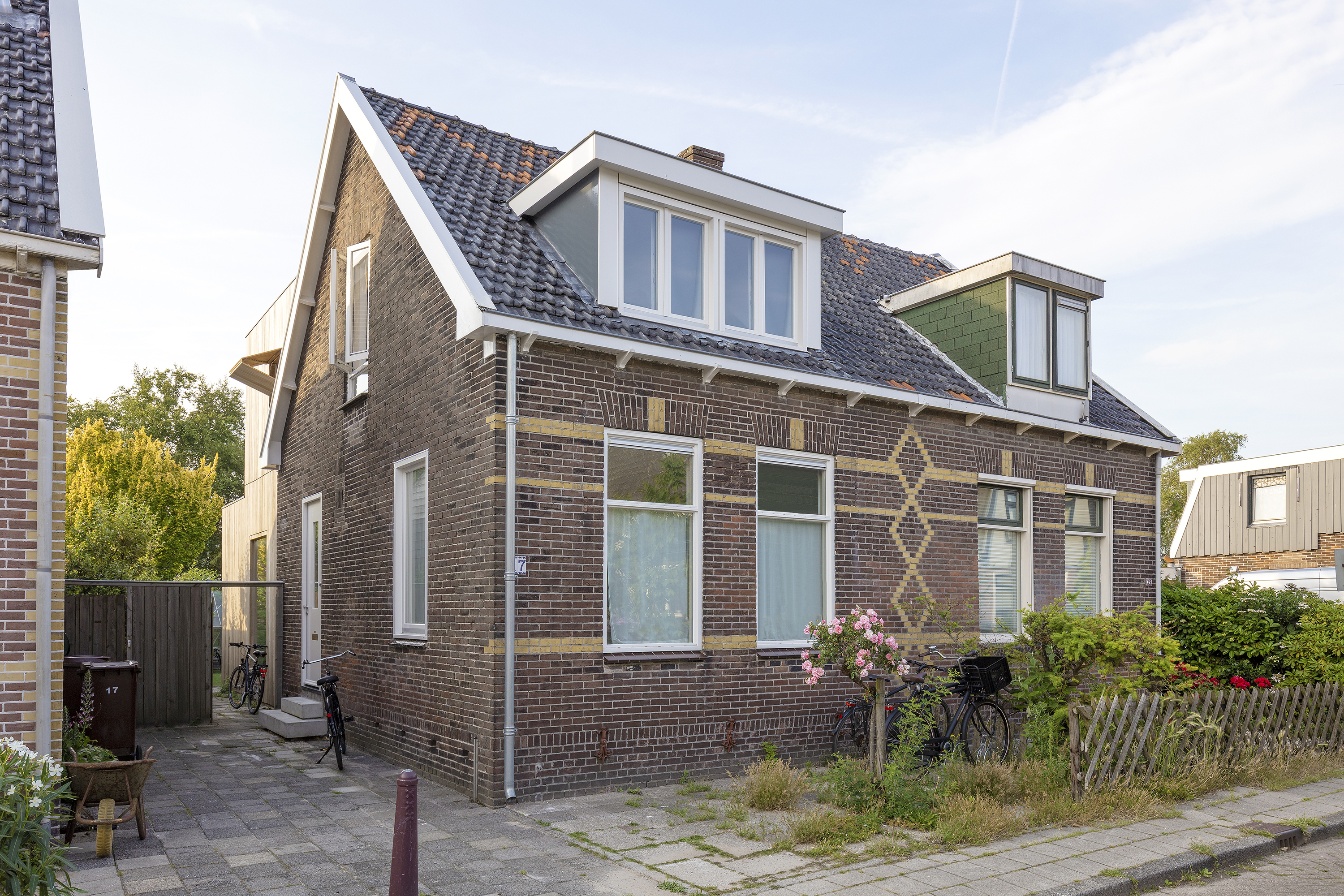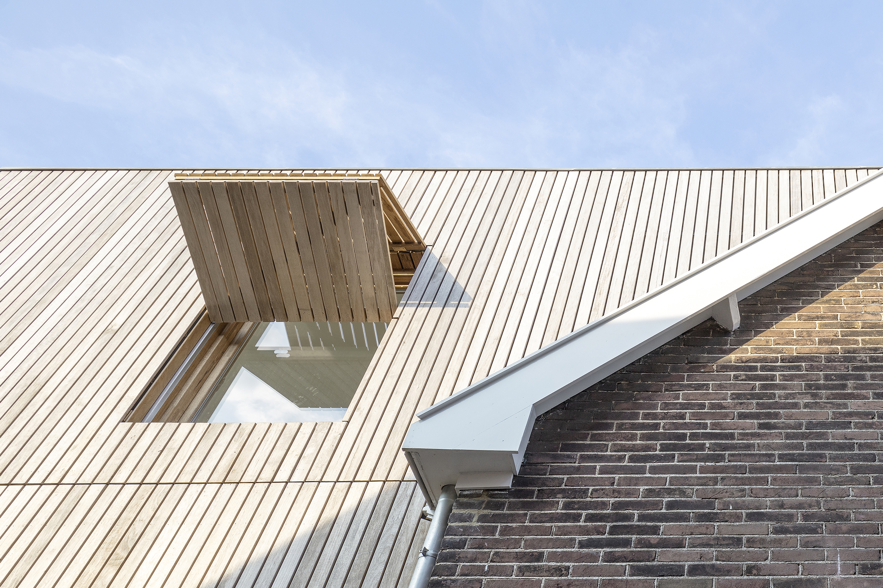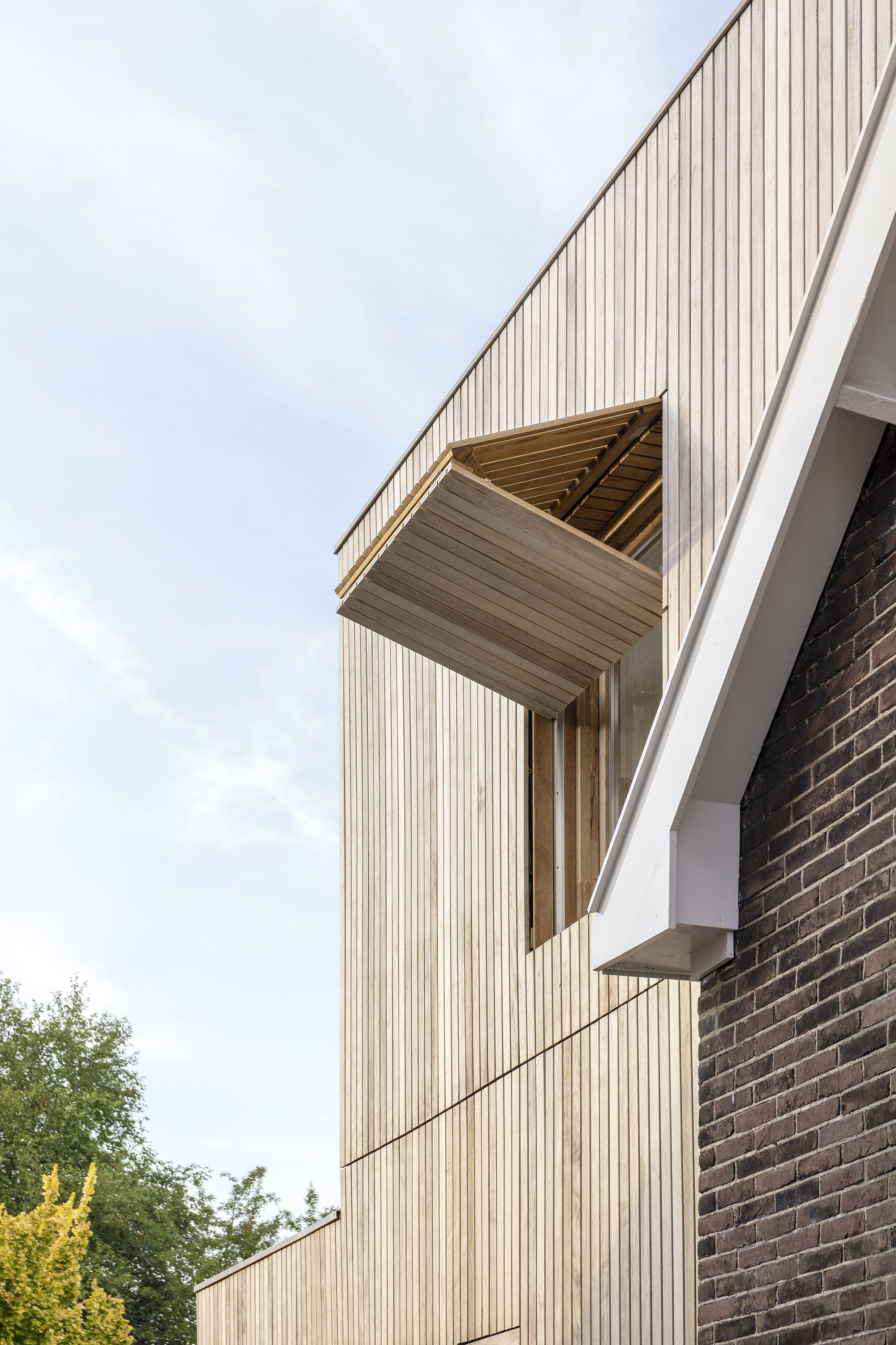 De uitbreiding onderscheidt zich als eigentijds ontworpen volume van de oude woning en is als een moderne toevoeging duidelijk herkenbaar gemaakt. De afwerking van de nieuwbouw met Fraké geveldelen en kozijnen sluit aan bij het karakter van de tuin en de bijgebouwen. Alle houten elementen in de gevel zijn onbehandeld en zullen in de loop der tijd op een natuurlijke manier vergrijzen.