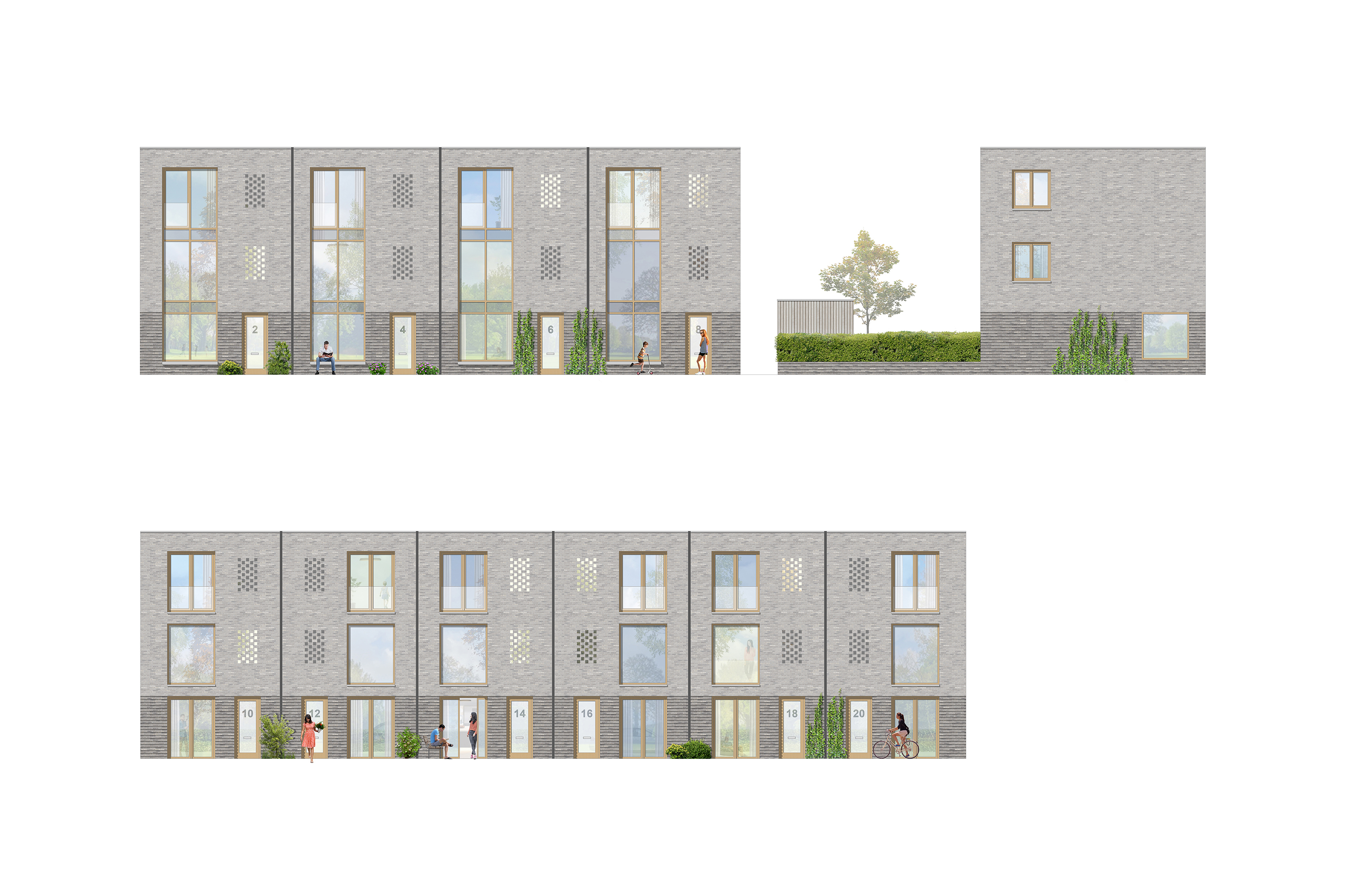 De 14 eengezinswoningen hebben een sterke onderlinge samenhang door op de begane grond in de tuinmuren een iets donkerdere gevelsteen en een horizontale profilering in het metselwerk toe te passen. Tegelijkertijd zijn de woningen middels terug liggende hemelwaterafvoeren duidelijk geaccentueerd als individuele bouwstenen in een stedelijk ensemble.