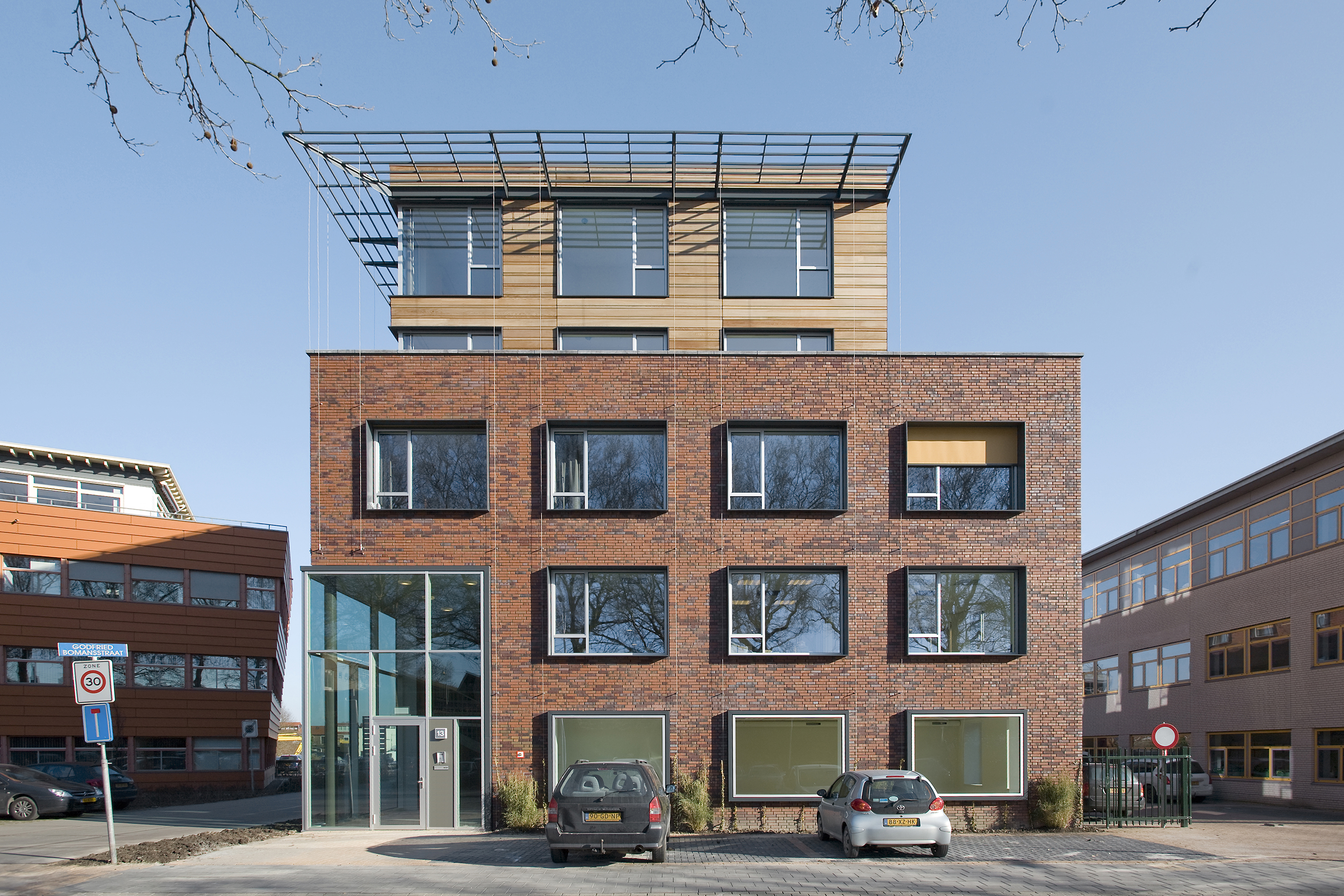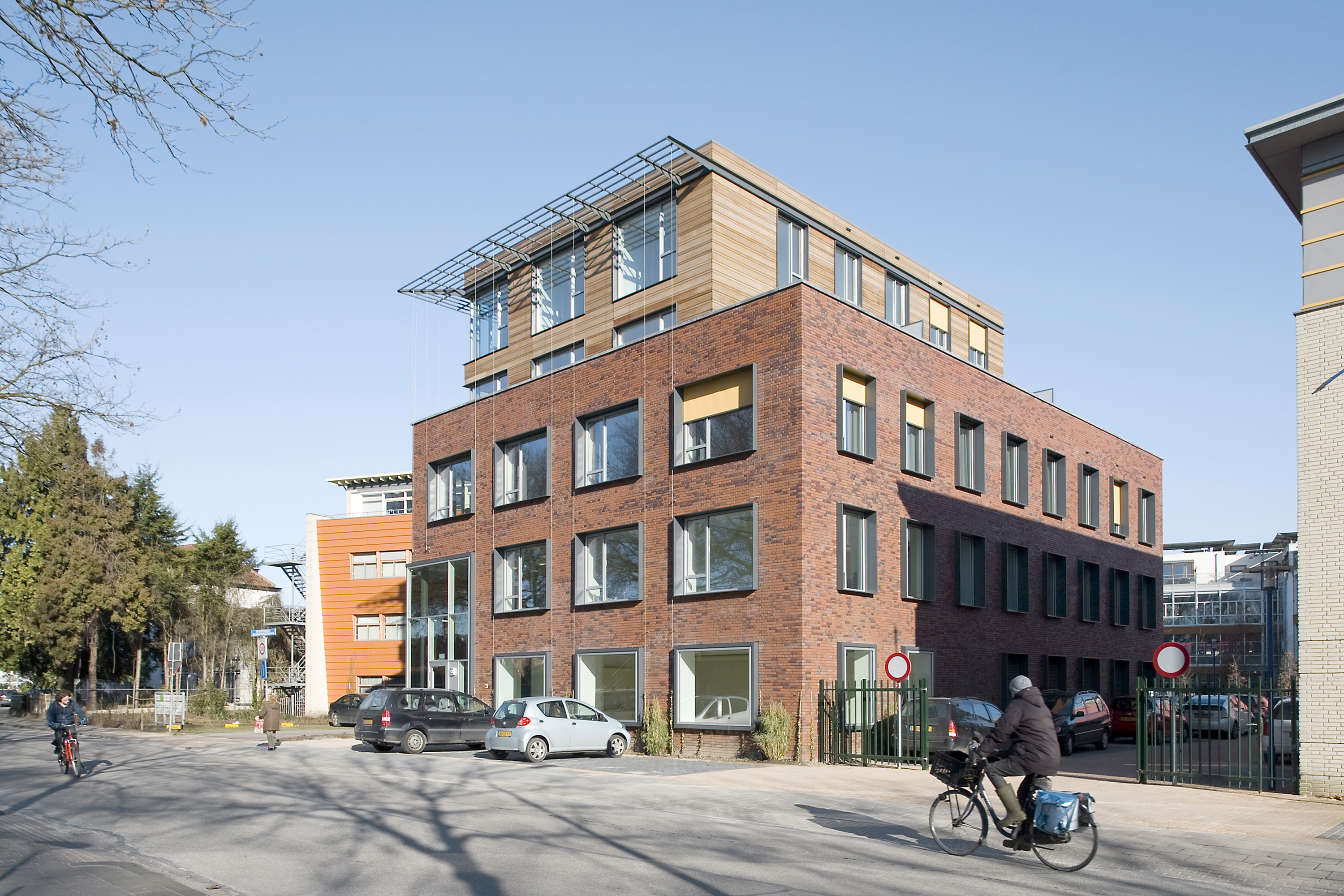 Het 5-laagse volume vormt een stedenbouwkundig accent voor de entree van het daarachter liggend gebied. Om de aansluiting bij de omgeving te versterken liggen de bovenste twee bouwlagen iets terug en is gewerkt met een asymmetrische gevelcompositie. Een grote entreehal op de hoek van het gebouw zorgt voor een uitnodigend gebaar naar de voor- en zijkant toe. Passend bij het duurzame karakter van de wijk is ervoor gekozen om de gemetselde gevels van de onderste drie bouwlagen in de loop van de komende jaren te laten begroeien door groenblijvende en bloeiende klimplanten.